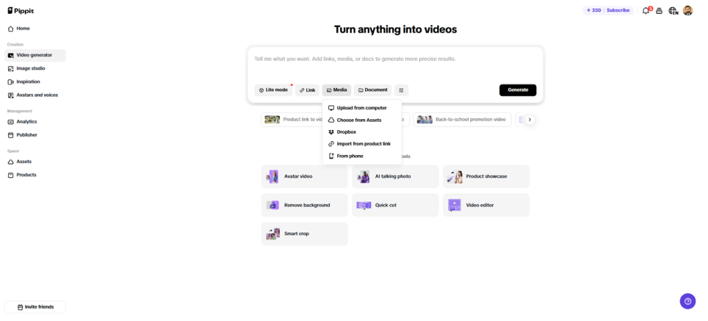 Step 1: Load Your Media Navigate to the “Video generator” section and tap “Add media” to bring in your footage. The user-friendly design helps you start fast. Use the AI auto video editor to simplify early adjustments.